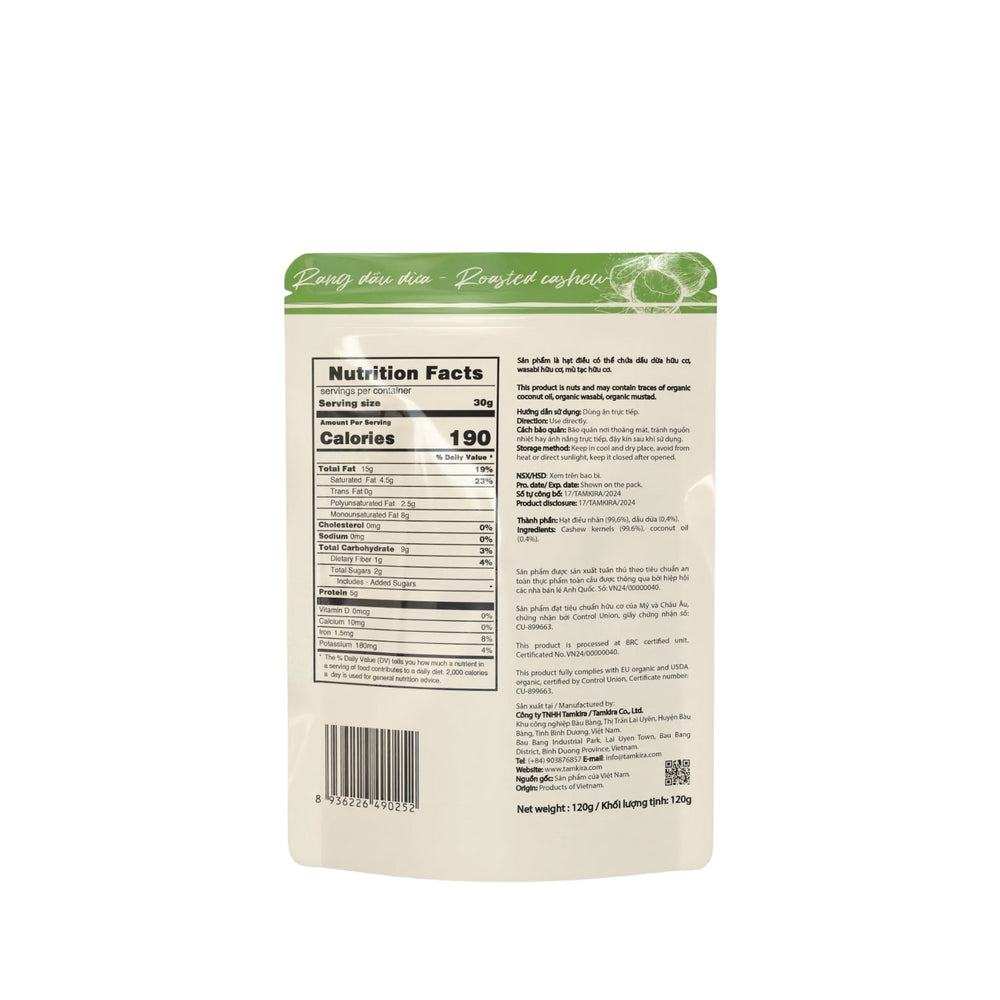 These cashew nuts are dry-roasted, offering a naturally rich and buttery flavor, subtly infused with the aroma of tropical coconut oil, and a satisfying crunch with every bite. A traditional yet irresistible combination. Perfect to pair with other healthy foods like oatmeal, yogurt, salads, etc.